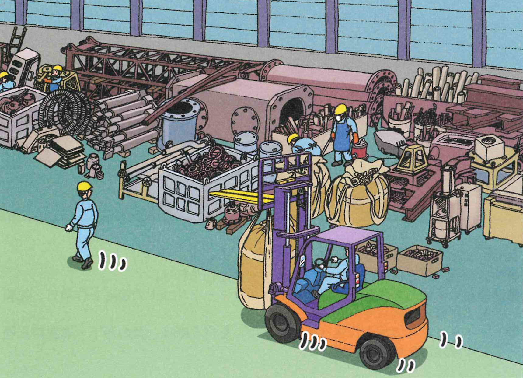 - 誘導員の配置や警報装置の活用により、フォークリフトの接近を作業員・運転者双方に確実に知らせる。